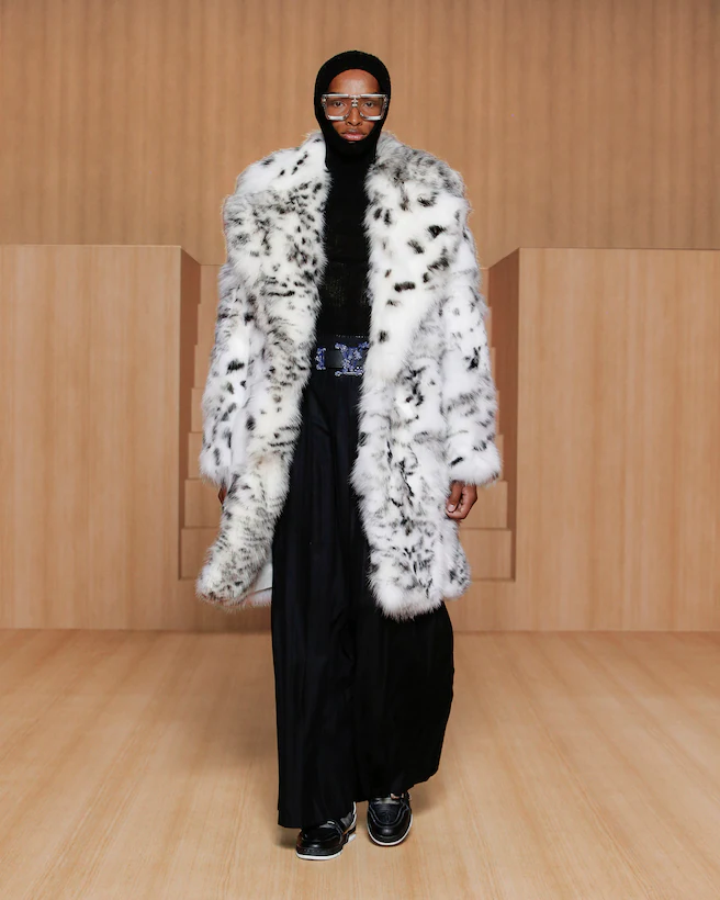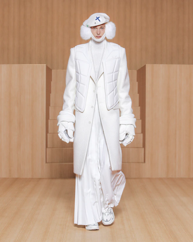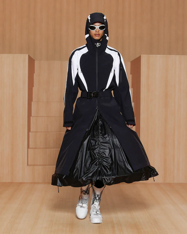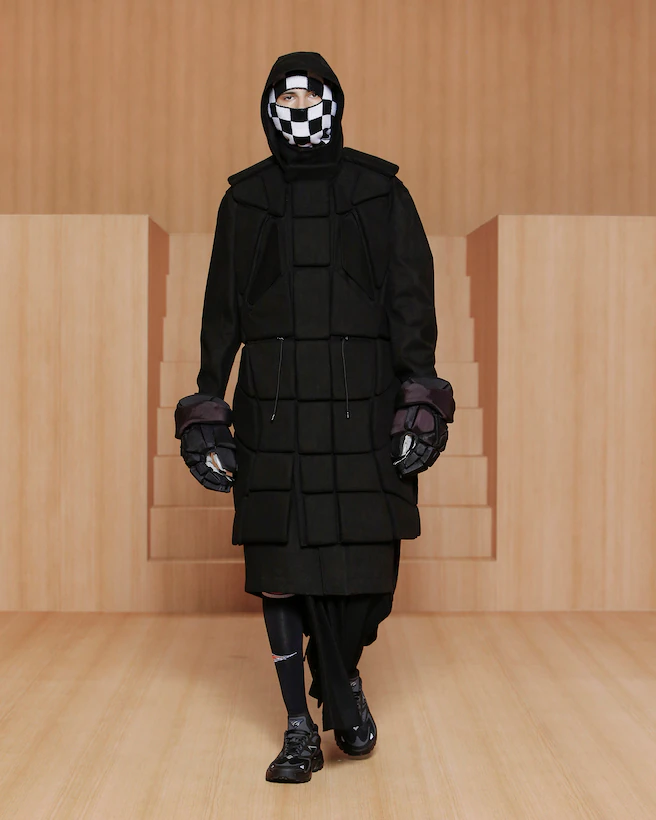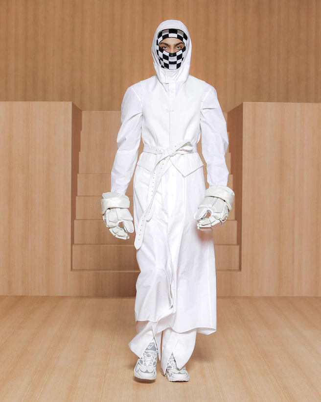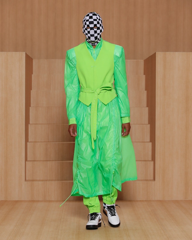 A recurring motif in the collection, the genetics of rave serve as an example of the cross-cultural gene pool found in the makeup of many of the subcultures fashion draws on today. An icon of rave dressing, the tracksuit is loaded with social preconceptions. Juxtaposed with the tailored suit, Virgil Abloh at once activates and neutralizes the unconscious biases connected to both wardrobe staples. Addressing the gender-related archetypes tied to certain garments, the collection focuses on elongated lines as a purely human approach to dressing.